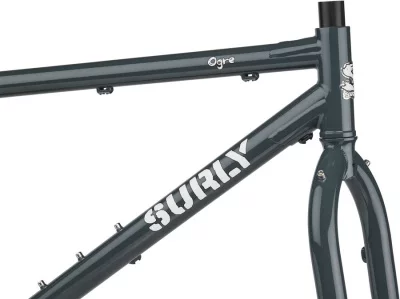 Frame Ogre, 100% Surly Chromoly steel, Natch tubing, double-butted frame triangle, TIG welded, E.D. coated. Fork Ogre, 100% Surly Chromoly steel, Natch tubing, double-butted, TIG welded, E.D. coated. Frame color orlok's shadow. Front spacing 10x100mm. Rear spacing "Gnot-Boost" 145mm, 12 x 142mm OR 12 x 148mm. Front brake mount 51mm I.S. (203mm max.). Rear brake mount 51mm I.S. Fork height 445mm. Offset 45mm. Headset EC34/28.6 | EC34/30, 1-1/8" seatpost diameter 27.2mm Front derailleur (clamp) High direct mount top-pull (Ø31.8mm) Drivetrain Chainrings max. MTN 1x: 42T, 2x: 46/34T, 3x: 48/36/24T | max. BOOST 1x: 46T, 2x: 48/42T Bottom bracket 73mm BSA Tire clearance Frame: 27.5" x 3.0", 29" x 2.5" | Fork: 27.5" x 3.0", 29" x 2.5" Bottle cage mounts Frame size XS: 2x triple eyelets on the frame, 4x triple eyelets on the fork Frame sizes S-XL: 1x standard mount + 2x triple eyelets on the frame, 4x triple eyelets on the Fork luggage rack mounts Yes
