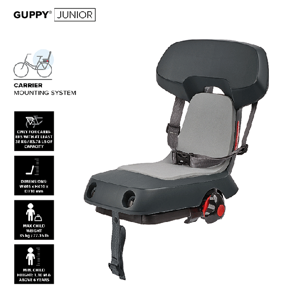 Veel ouders gebruiken de fiets voor het dagelijkse woon-werkverkeer. Praktisch en rijstabiliteit zijn de belangrijkste eigenschappen die Guppy Junior de IF Design Award en German Design Award hebben bezorgd. Dit komt omdat het een eenvoudig en praktisch ontwerp combineert met een stevige dubbele coating en een lichtgewicht structuur om dagelijks gebruik te weerstaan. Guppy Junior heeft nu een bevestigingsbasis voor de kofferbak, wat zich vertaalt in een betere pasvorm voor e-bikes en meer dagelijkse functionaliteit.